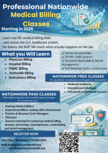 CFCHO also offers next level classes for aspiring Medical Billers, current employee regardless of status to enhance your skills, become a valuable assets to your company, learn techniques to reverse denial claims to high driven revenue within 3 weeks.